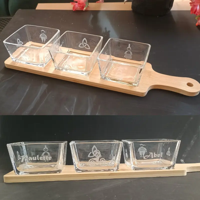 6. Set Apéritif Personnalisé (3 Coupelles + Planche en Bambou)