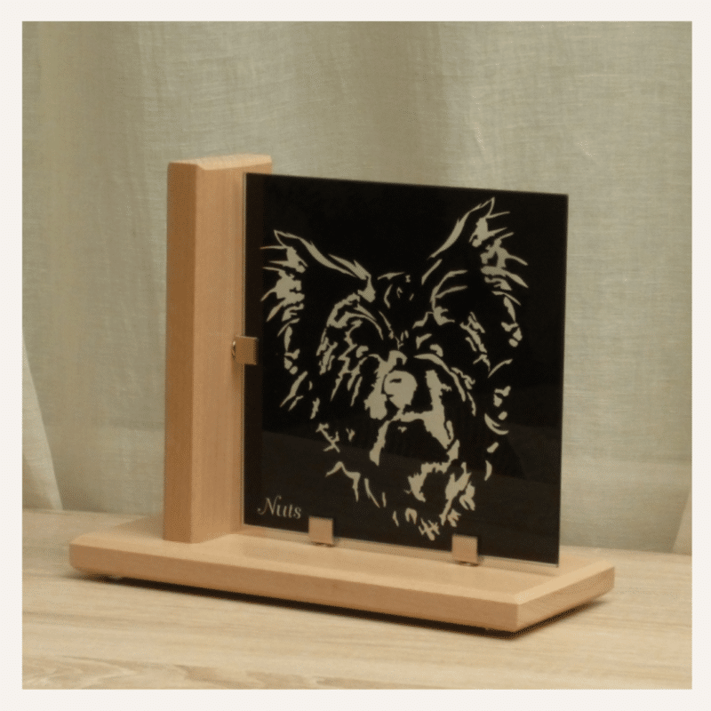 Chien gravé sur verre noir objet déco
