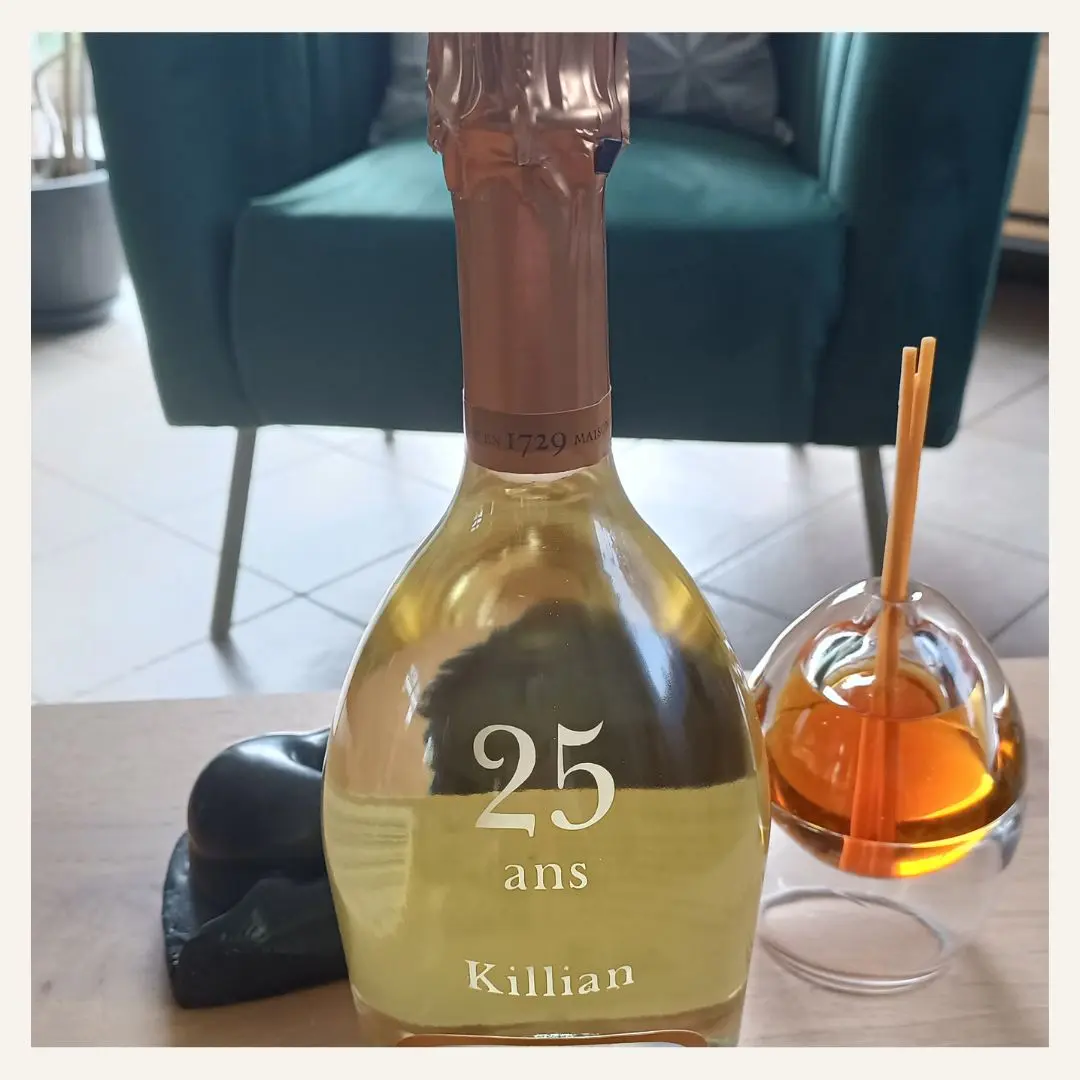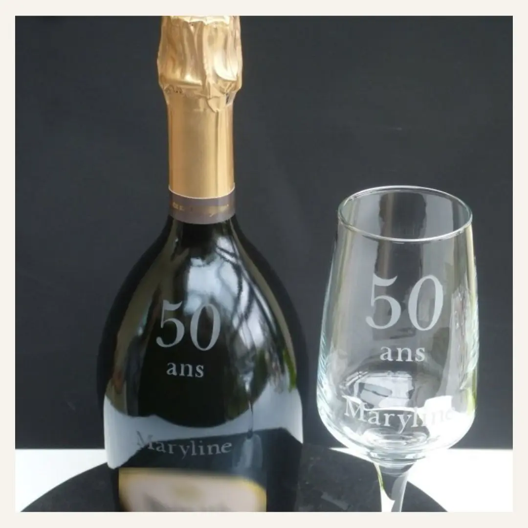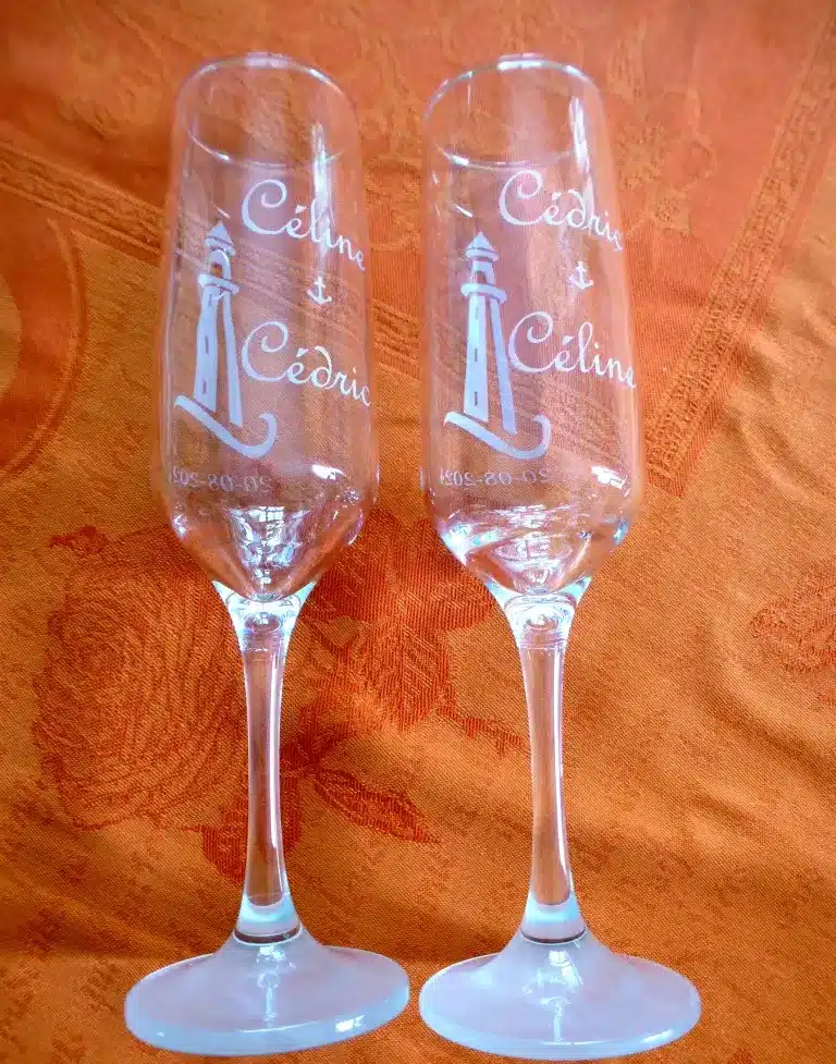 Flûtes gravées pour un mariage avec les prénoms des mariés et le thème phare du mariage… Lire la suite