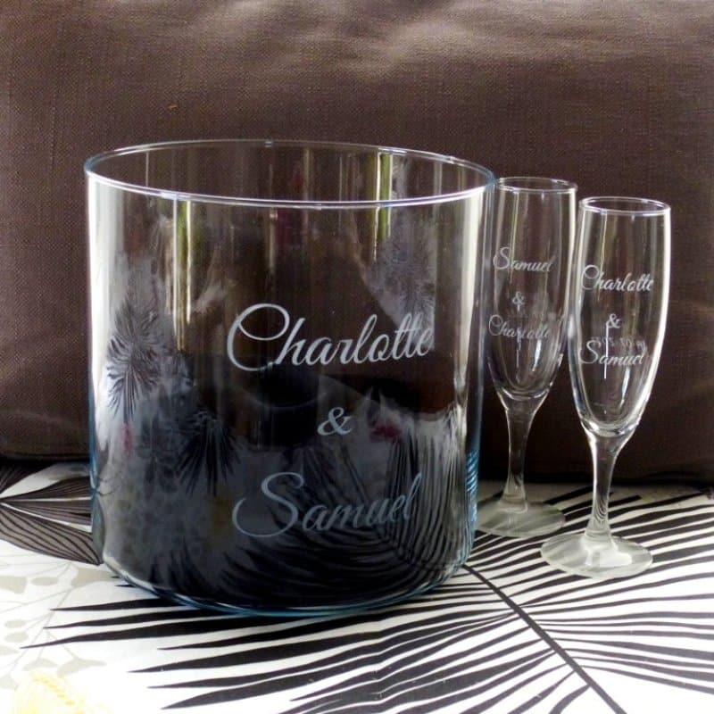 gravure sur verre personnalisée par sablage vase et flûtes mariage