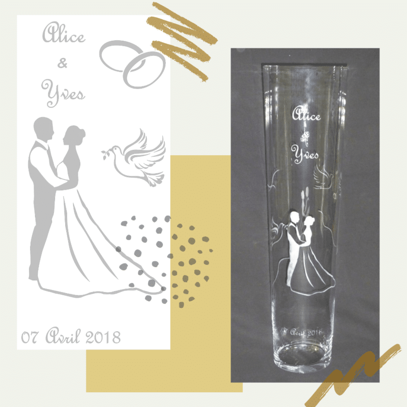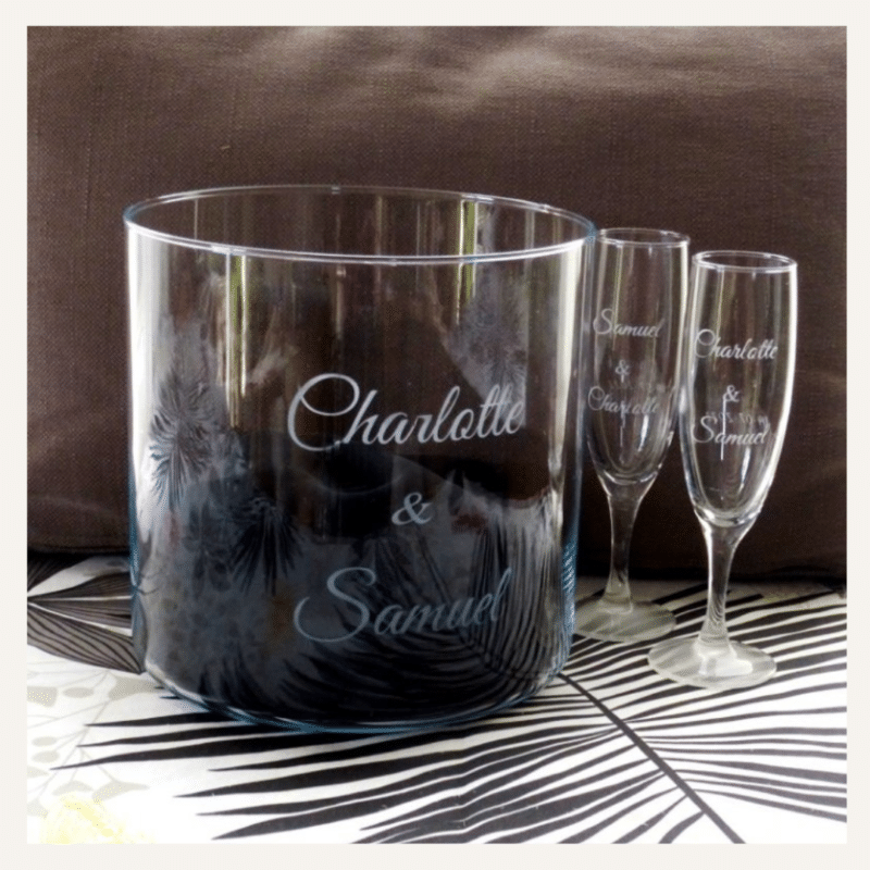 Flûtes gravées personnalisées avec les prénoms des mariés accompagnées d’un vase gravé… Lire la suite